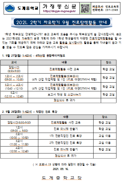 2021. 2학기(9월) 자유학기 진로탐활동 가정통신문.hwp