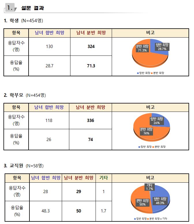 2023학년도 재학생 학급편성(남녀 합반·분반)에 관한 교육공동체 (학생, 학부모, 교직원) 의견 수렴 결과