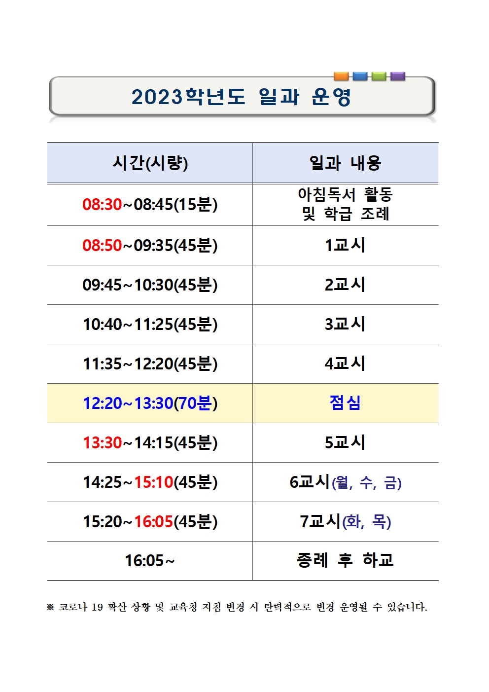 2023학년도 본교 일과는 다음과 같이 운영되니, 참고하시기 바랍니다.