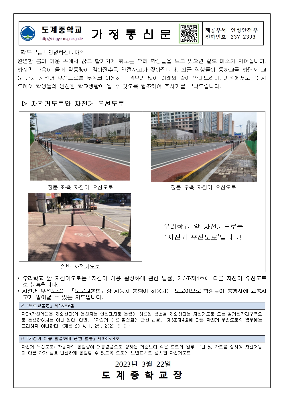 2023. 자전거도로 안전수칙 가정통신문을 안내합니다. 가정에서 관심과 지도 부탁드립니다.