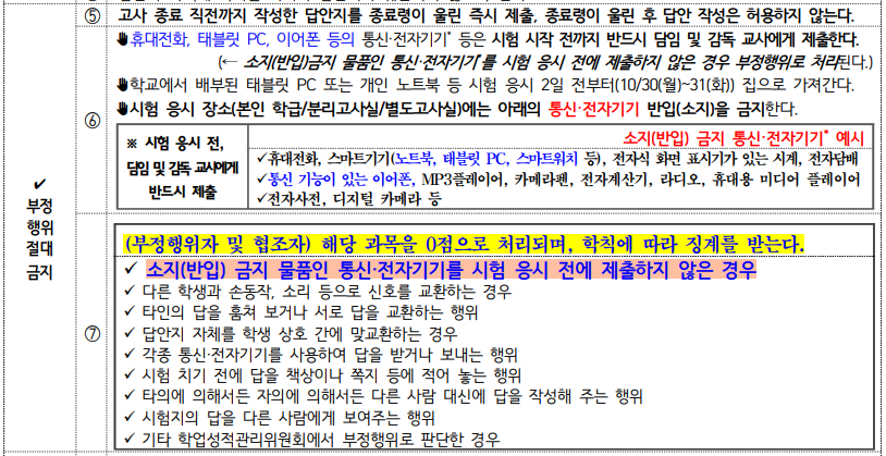 --소지(반입)금지 통신전자기기 미제출시, 부정행위처리되어 해당 과목은 0점으로 처리