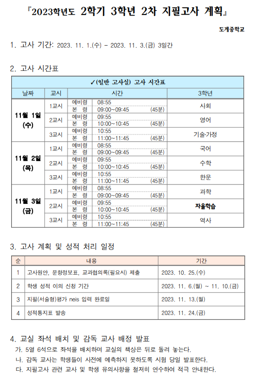 1. (2학기 3학년 1차) 지필고사 계획(코로나19 관련)은 붙임 파일과 같습니다.